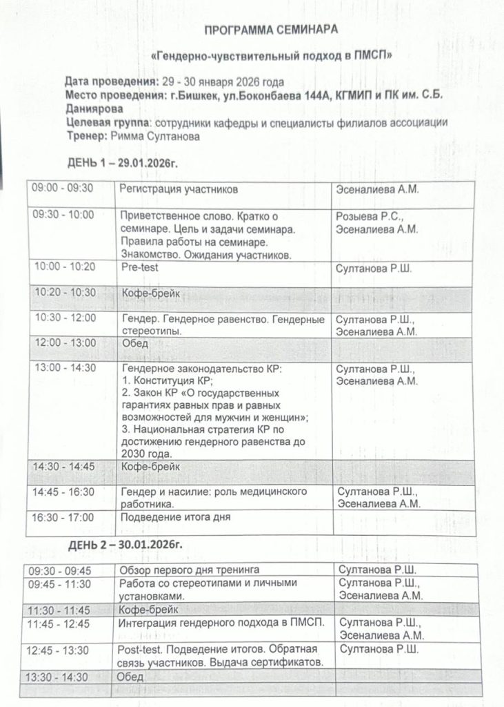 29–30 января Кыргызский государственный медицинский институт переподготовки и повышения квалификации (КГМИПиПК) им. С.Б. Даниярова становится площадкой для важного образовательного события. Кафедра «Управления и экономики здравоохранения» совместно с Ассоциацией групп семейных врачей и семейных медсестер КР проводит двухдневный тренинг: «Гендерно-чувствительный подход в ПМСП».